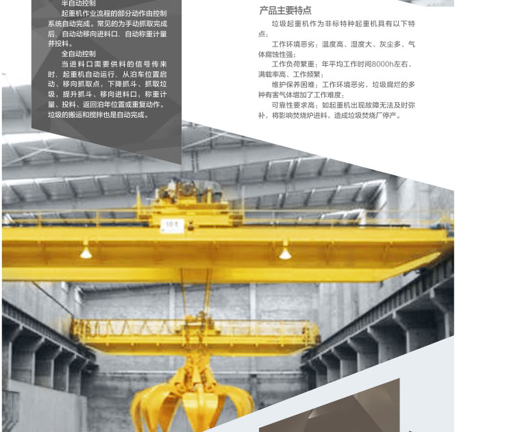 2、 我公司生產(chǎn)的垃圾抓斗起重機能執(zhí)行嚴格的提升及輸送作業(yè),確保垃圾焚燒發(fā)電廠的正常作業(yè)。